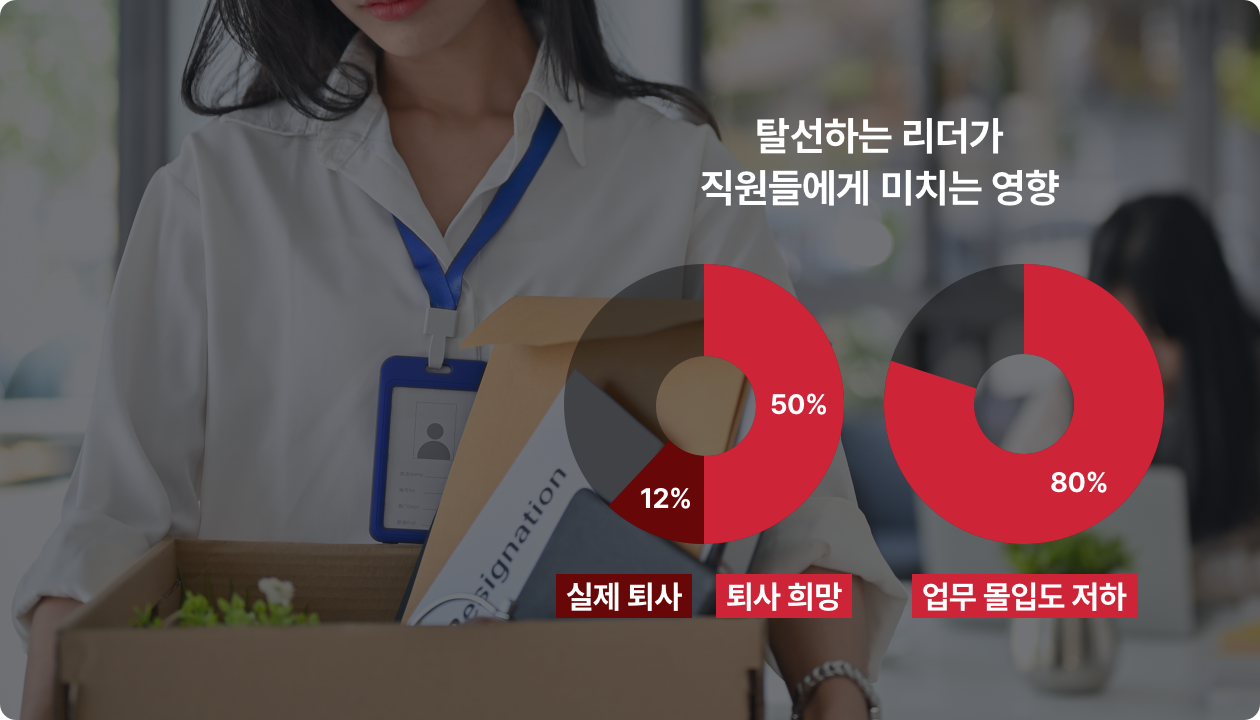 이때, 리더의 실패 유발 요소를 '리더십 디레일러(Leardership Derailer)'라고 합니다. 디레일러(Derailer)는 기차가 선로를 벗어난 탈선사고를 일컫는 단어로, 리더십 디레일러는 리더로서 하지 말아야 할 여러 탈선 행동 및 성격, 특성을 의미해요. 탈선하는 리더는 조직에 부정적인 영향을 미치는데요. 전 세계 500대 기업 리더를 대상으로 한 연구*에 의하면, 탈선하는 리더로 인해 직원의 50%는 퇴사를 희망하고, 12%는 실제로 퇴사한다고 합니다. 그리고 직원의 80%는 업무에 몰입하지 못한다고 해요.